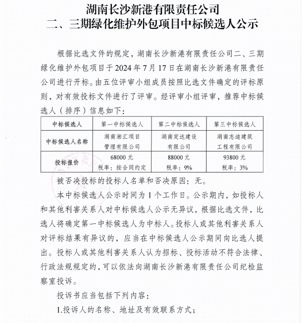 湖南長沙新港有限責(zé)任公司二、三期綠化維護(hù)外包項(xiàng)目中標(biāo)候選人公示