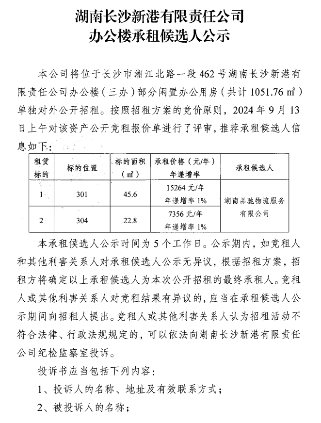 湖南長(zhǎng)沙新港有限責(zé)任公司辦公樓承租候選人公示